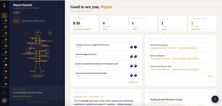 The dashboard is a live view of your coaching profile, built from your stories, scored from your evidence, and ready to work alongside every session with your coach.